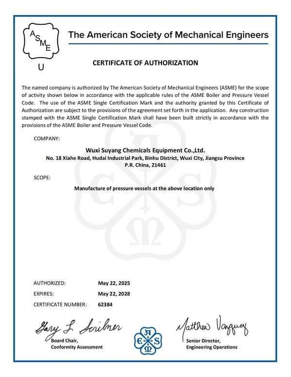近日,无锡狗万官网化工装备有限公司成功获得美国机械工程师协会(ASME)颁发的重要证书,这一成就标志着公司在化工设备制造领域达到了国际顶尖水平,为其进一步拓展全球市场奠定了坚实基础。